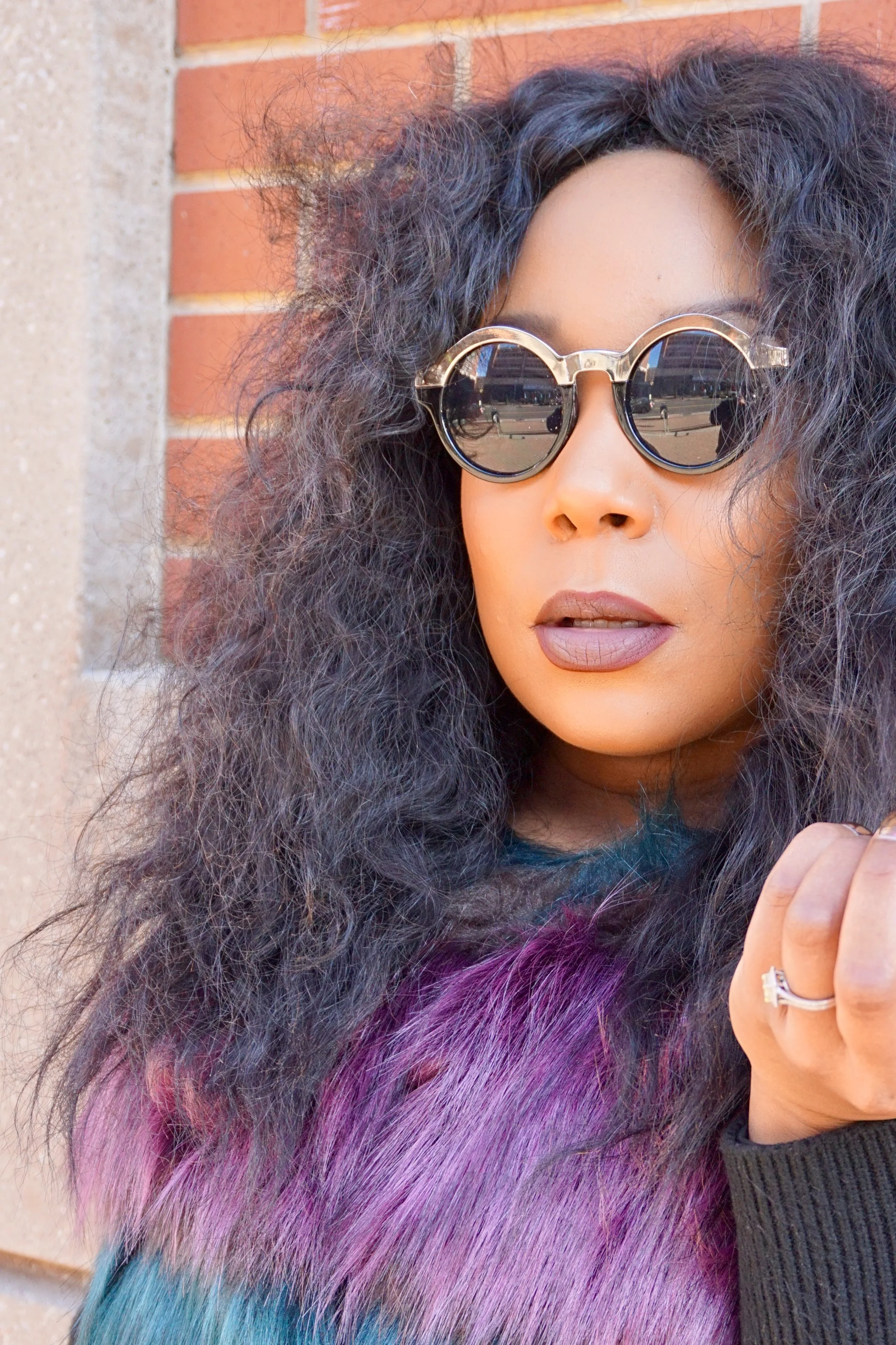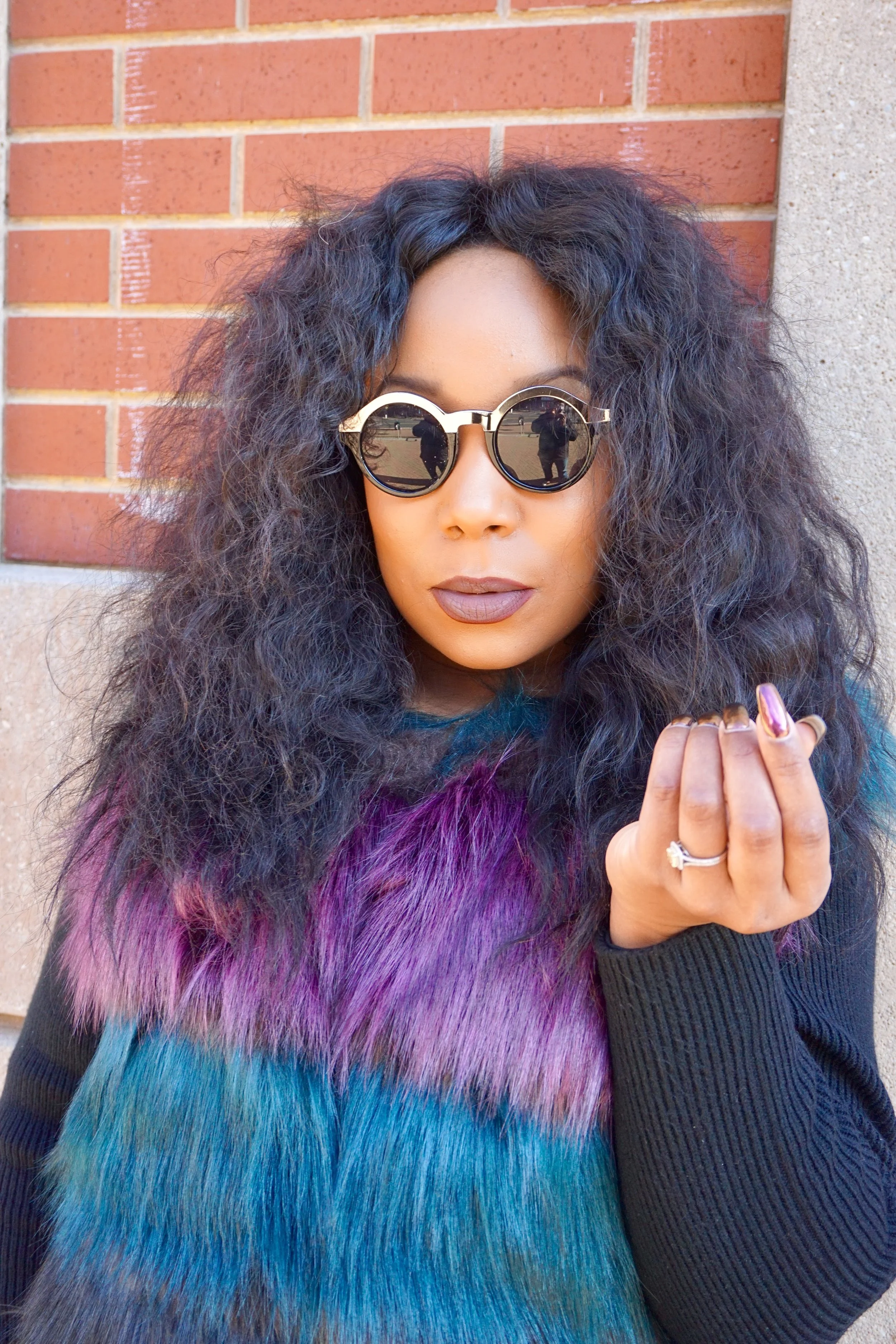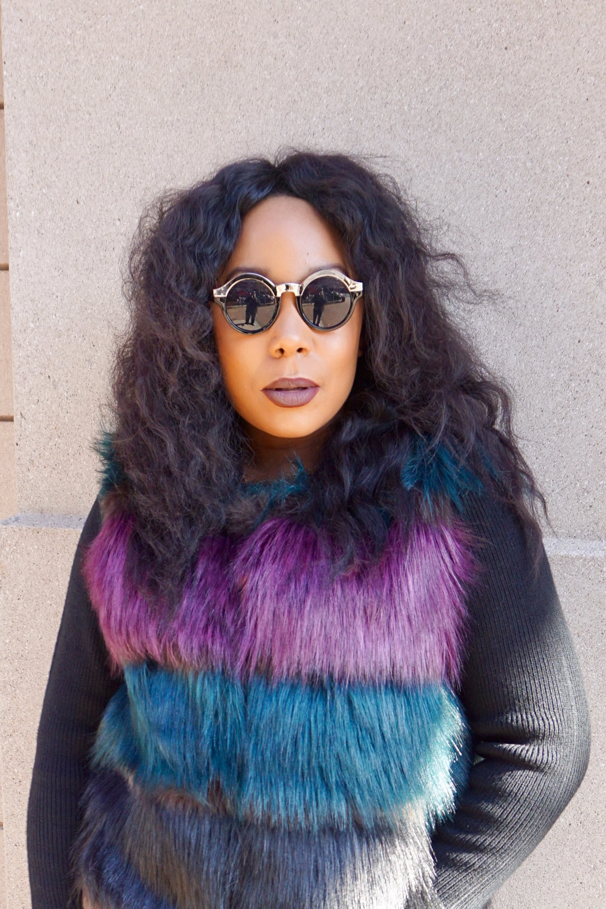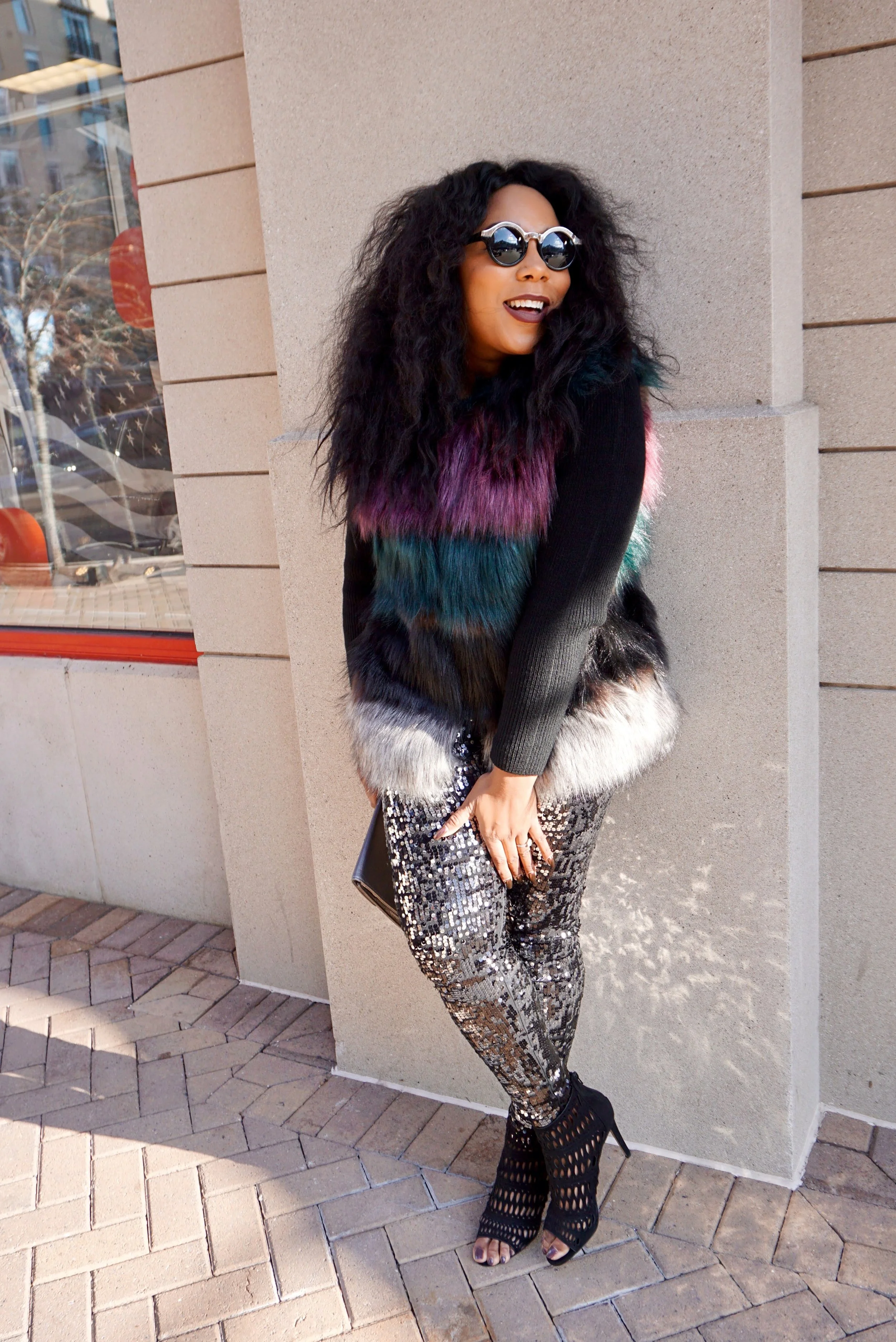I was minding my own business, window shopping on NY&Company's website. You know when you are just looking when you KNOW you really shouldn't be!? Annnnnd BAM! I saw the colorful faux fur and said, LAWD why is this right here? Then, I said Thank YOU Lawd for this being right here! Instantly, I had to have it. I was hesitant at first because I wanted it to look as lush as it does on the site. I bought my grey faux fur vest from NY&Co last year (see here) and I love it. So ya girl took a chance, I bought it and I love it. I wish I could wear it every day. Ok, that may be a bit excessive but you get my drift.